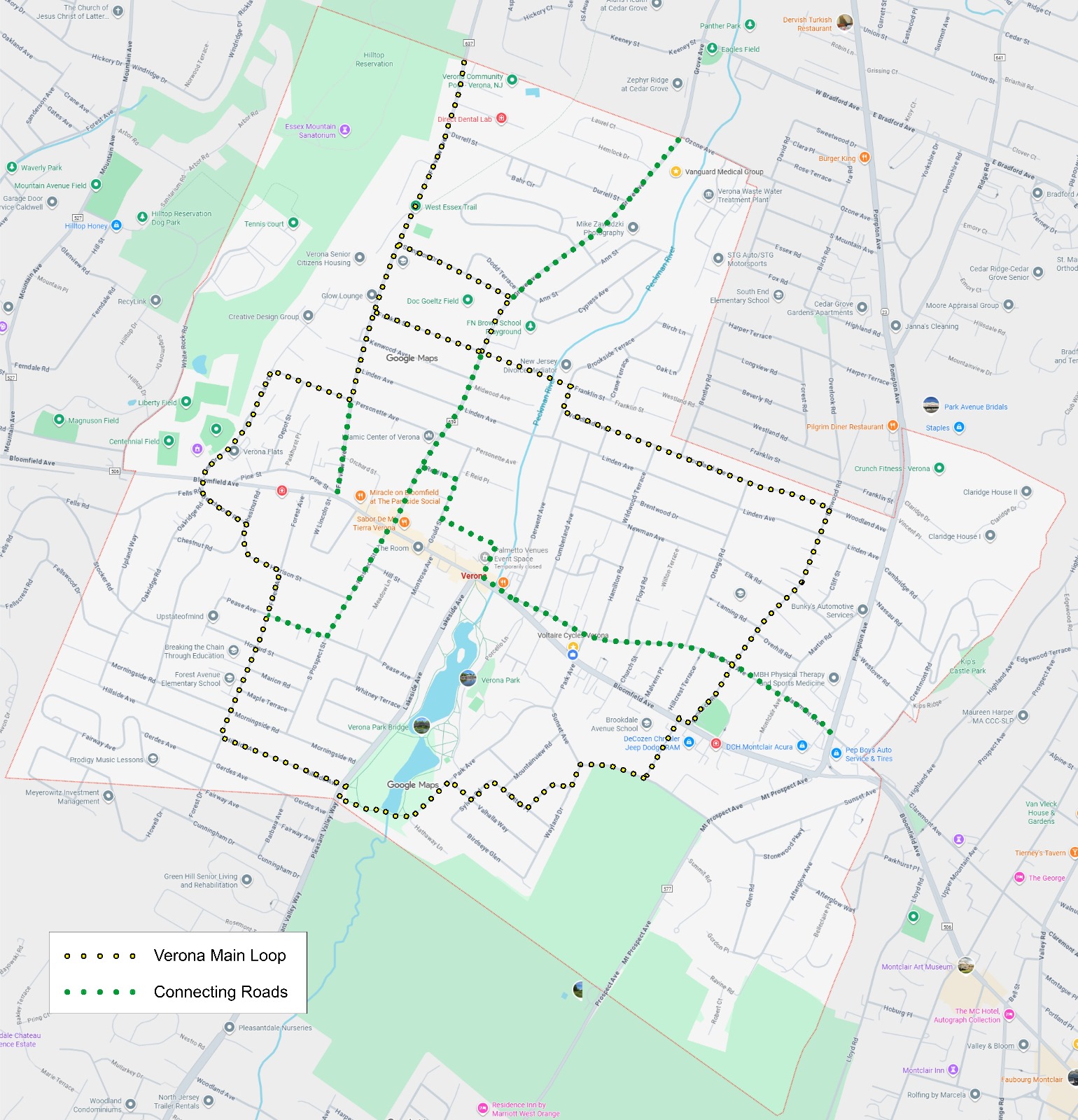 The Verona loop is meant to help people get across the quadrants of Verona, which are most difficult to cross because they are bisecting major state Roads: Lakeside Ave., Bloomfield Avenue, and to some extent Fairview and Grove.